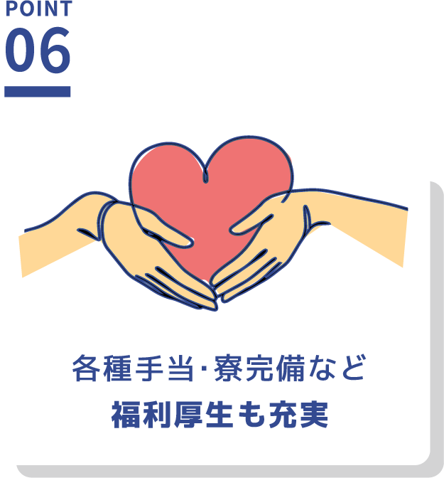 | 待遇・福利厚生 | 社会保険完備(健康保険・雇用保険・労災保険・厚生年金) 寮・社宅有 / 資格取得支援制度 |